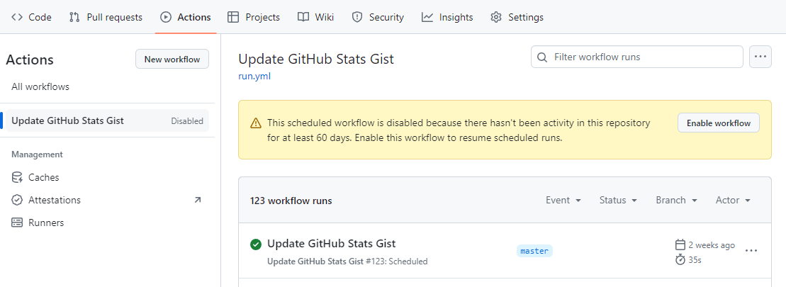 토큰을 재발급한 후에는 위 이미지처럼 gist의 workflow가 disabled 상태여서 업데이트가 되지 않는다. 때문에 enabled workflow 버튼을 클릭해 gist가 정상적으로 업데이트되도록 한다.